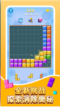 3、将不同颜色的方块拖到棋盘中,填满任意一行或一列就可消除! 多种趣味玩法,任你挑战,让你的烦恼快速消除!